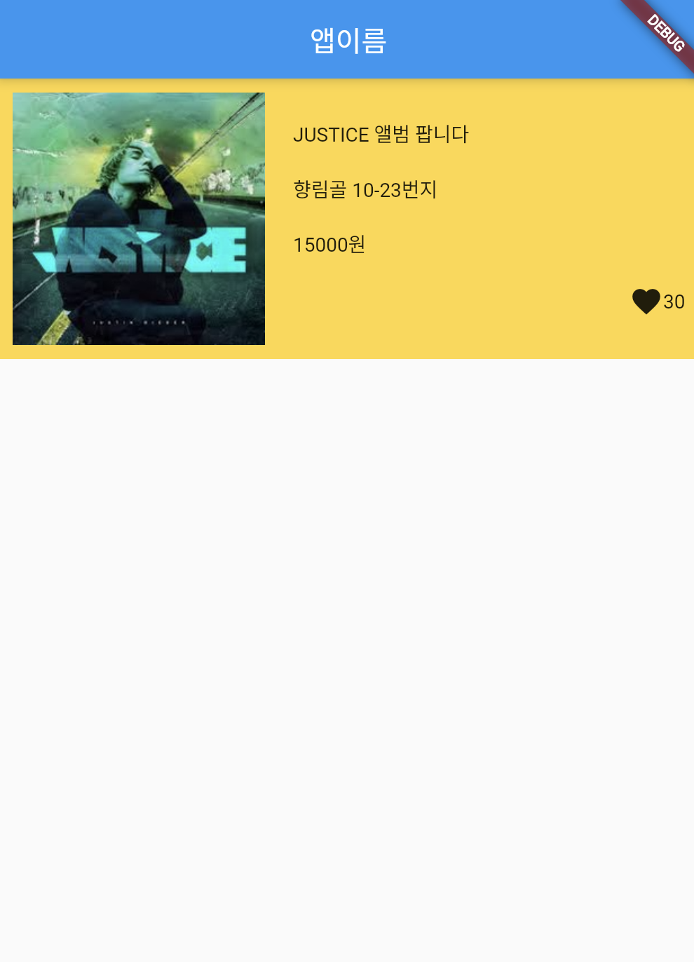 children: [Text('JUSTICE 앨범 팝니다'), Text('향림골 10-23번지'),Text('15000원'),